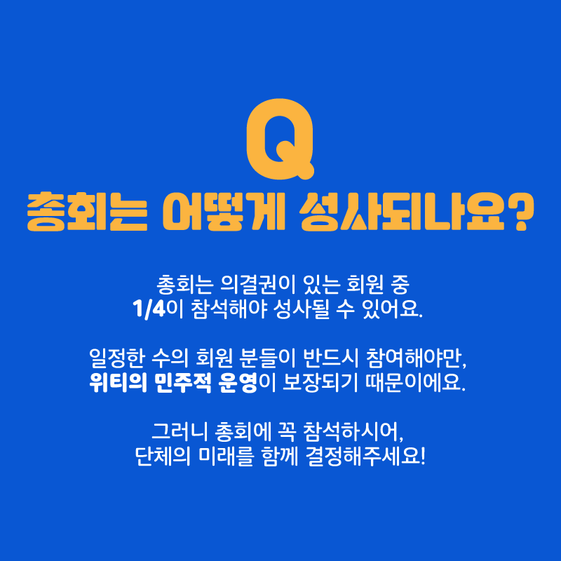 ์ดํ๋ ์๊ฒฐ๊ถ์ด ์๋ ํ์ ๋ถ๋ค์ 1/4๊ฐ ์ฐธ์ํด์ผ ์ฑ์ฌ๋ ์ ์์ด์. ์ผ์ ํ ์์ ํ์ ๋ถ๋ค์ด ๋ฐ๋์ ์ฐธ์ฌํด์ผ๋ง, ๋จ์ฒด์ ๋ฏผ์ฃผ์ ์ด์์ด ๋ณด์ฅ๋๊ธฐ ๋๋ฌธ์ด์์. ๊ทธ๋ฌ๋ ์ดํ์ ๊ผญ ์ฐธ์ํ์์ด, ๋จ์ฒด์ ๋ฏธ๋๋ฅผ ํจ๊ป ๊ฒฐ์ ํด์ฃผ์ธ์!