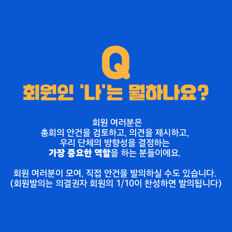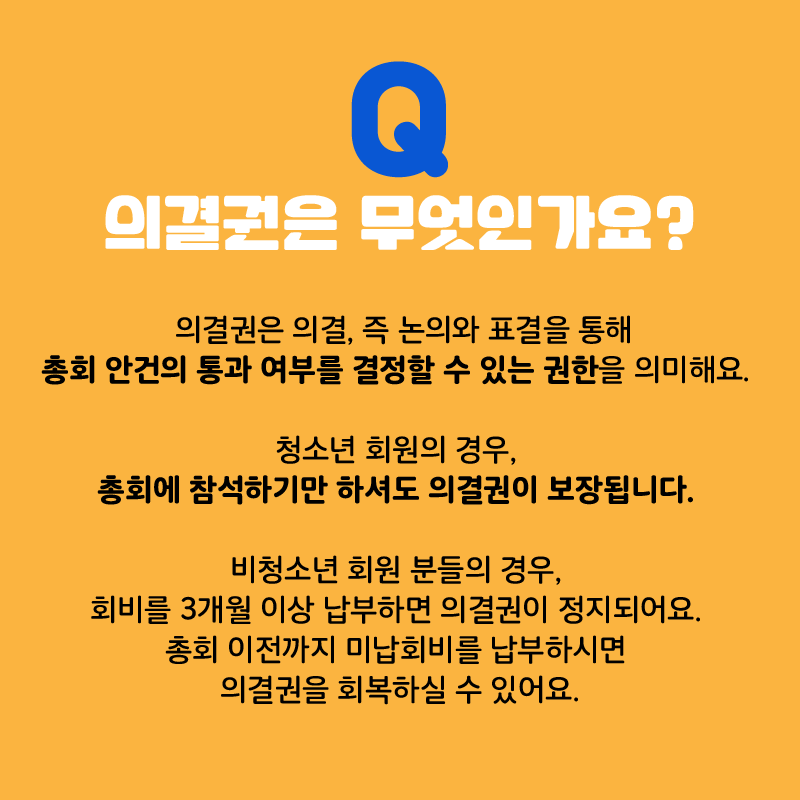ํ์ ์ฌ๋ฌ๋ถ์ ์ดํ์ ์๊ฑด์ ๊ฒํ ํ๊ณ , ์๊ฒฌ์ ์ ์ํ๊ณ , ์ฐ๋ฆฌ ๋จ์ฒด์ ๋ฐฉํฅ์ฑ์ ๊ฒฐ์ ํ๋ ๊ฐ์ฅ ์ค์ํ ์ญํ ์ ํ๋ ๋ถ๋ค์ด์์. ํ์ ์ฌ๋ฌ๋ถ์ด ๋ชจ์ฌ, ์ง์ ์๊ฑด์ ๋ฐ์ํ์ค ์๋ ์์ต๋๋ค. (ํ์๋ฐ์๋ ์๊ฒฐ๊ถ์ด ์๋ ํ์์ 1/10์ด ์ฐฌ์ฑํ๋ฉด ๋ฐ์๋ฉ๋๋ค)