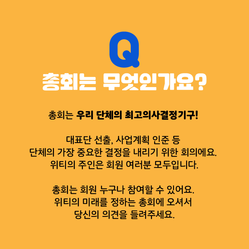 ์ดํ๋ ์ฐ๋ฆฌ ๋จ์ฒด์ ์ต๊ณ ์์ฌ๊ฒฐ์ ๊ธฐ๊ตฌ! ๋ํ๋จ ์ ์ถ, ์ฌ์ ๊ณํ ์ธ์ค ๋ฑ ๋จ์ฒด์ ๊ฐ์ฅ ์ค์ํ ๊ฒฐ์ ์ ๋ด๋ฆฌ๊ธฐ ์ํ ํ์์์. ์ํฐ์ ์ฃผ์ธ์ ํ์ ์ฌ๋ฌ๋ถ ๋ชจ๋์ ๋๋ค. ์ดํ๋ ํ์ ๋๊ตฌ๋ ์ฐธ์ฌํ ์ ์์ด์. ์ํฐ์ ๋ฏธ๋๋ฅผ ์ ํ๋ ์ดํ์ ์ค์ ์ ๋น์ ์ ์๊ฒฌ์ ๋ค๋ ค์ฃผ์ธ์.